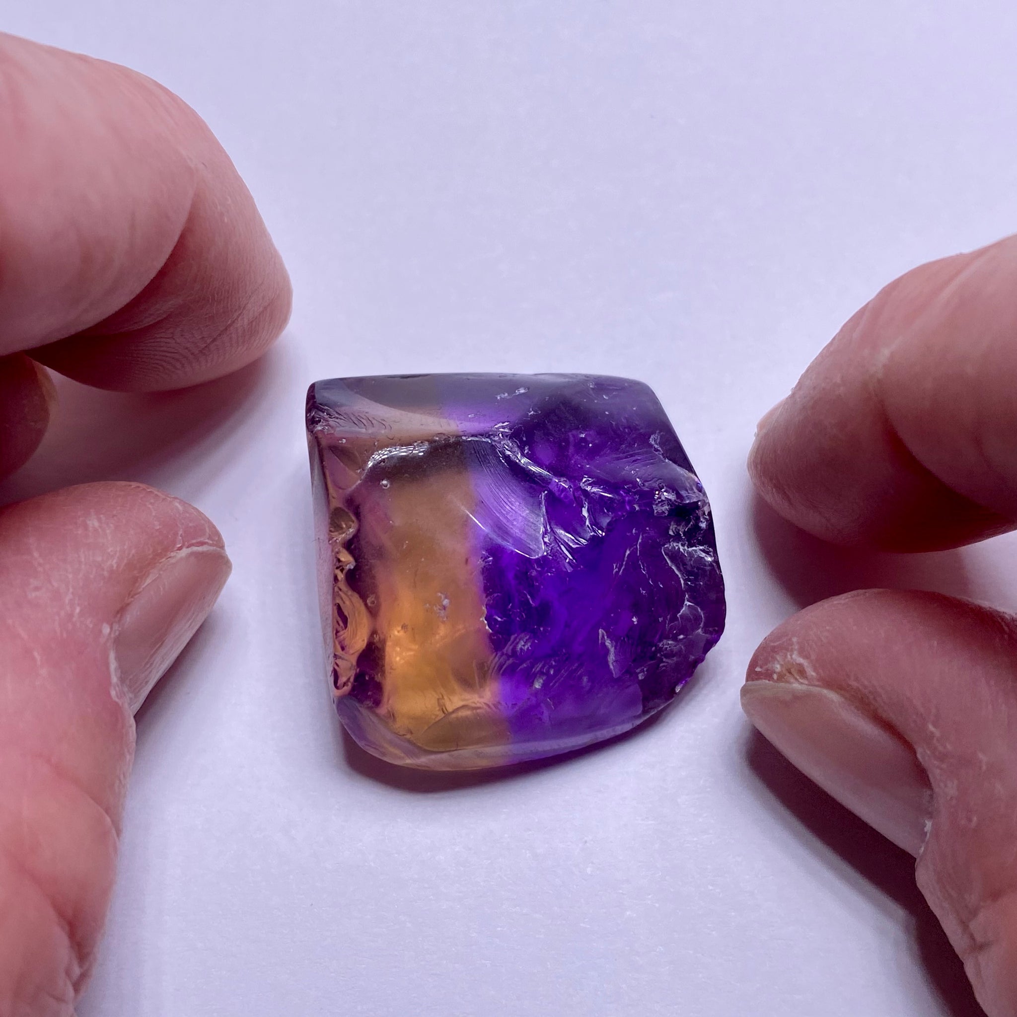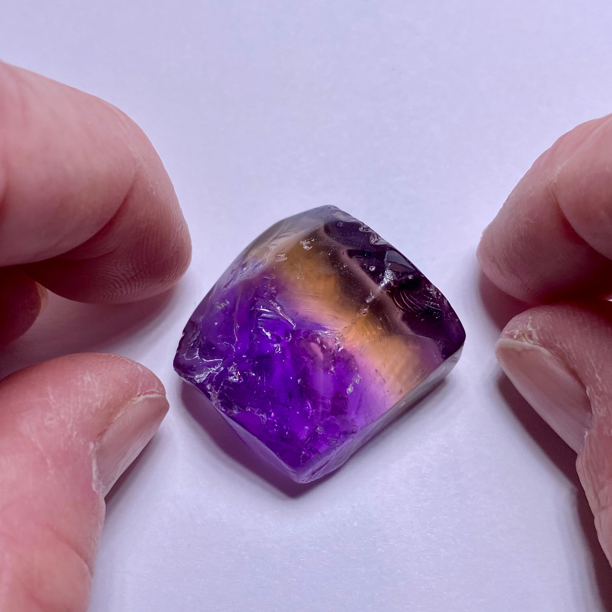 Jumbo Ametrine rough from Bolivia — showing the sharp natural boundary between purple amethyst and golden citrine caused by differing oxidation states of iron during crystal growth