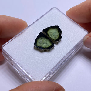 Old-stock watermelon tourmaline slices from Brazil, displaying vibrant pink cores surrounded by distinct green and dark outer zones. These natural cross-sections show the classic bullseye pattern that defines true watermelon tourmaline. Well-preserved and sharply banded, they're ideal for collectors or use in custom jewelry.