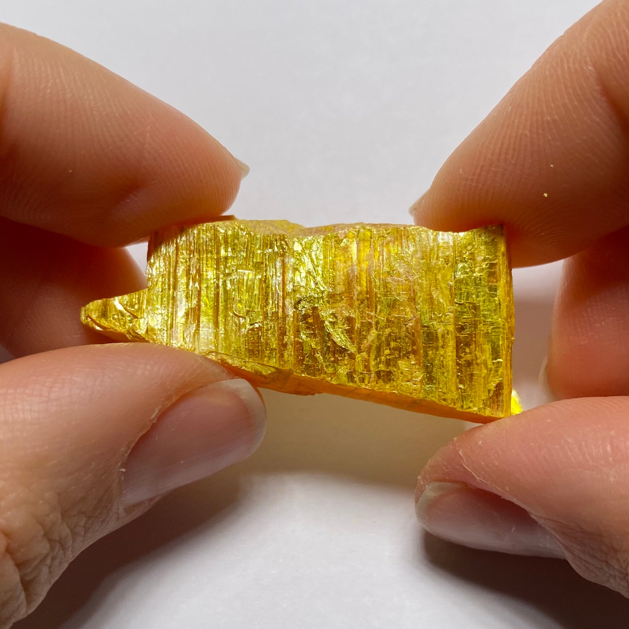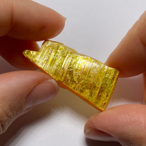 A striking piece of Orpiment, notable for its vibrant yellow color and layered, foliated structure. Orpiment is an arsenic sulfide mineral (As₂S₃) and is often associated with hydrothermal deposits, frequently found alongside other sulfides like realgar. Its name is derived from the Latin words "aurum" (gold) and "pigmentum" (paint), reflecting its brilliant golden-yellow hue. This piece would be a fascinating addition to any mineral collection, especially given its striking aesthetic and the relatively rare occurrence of high-quality crystals like this