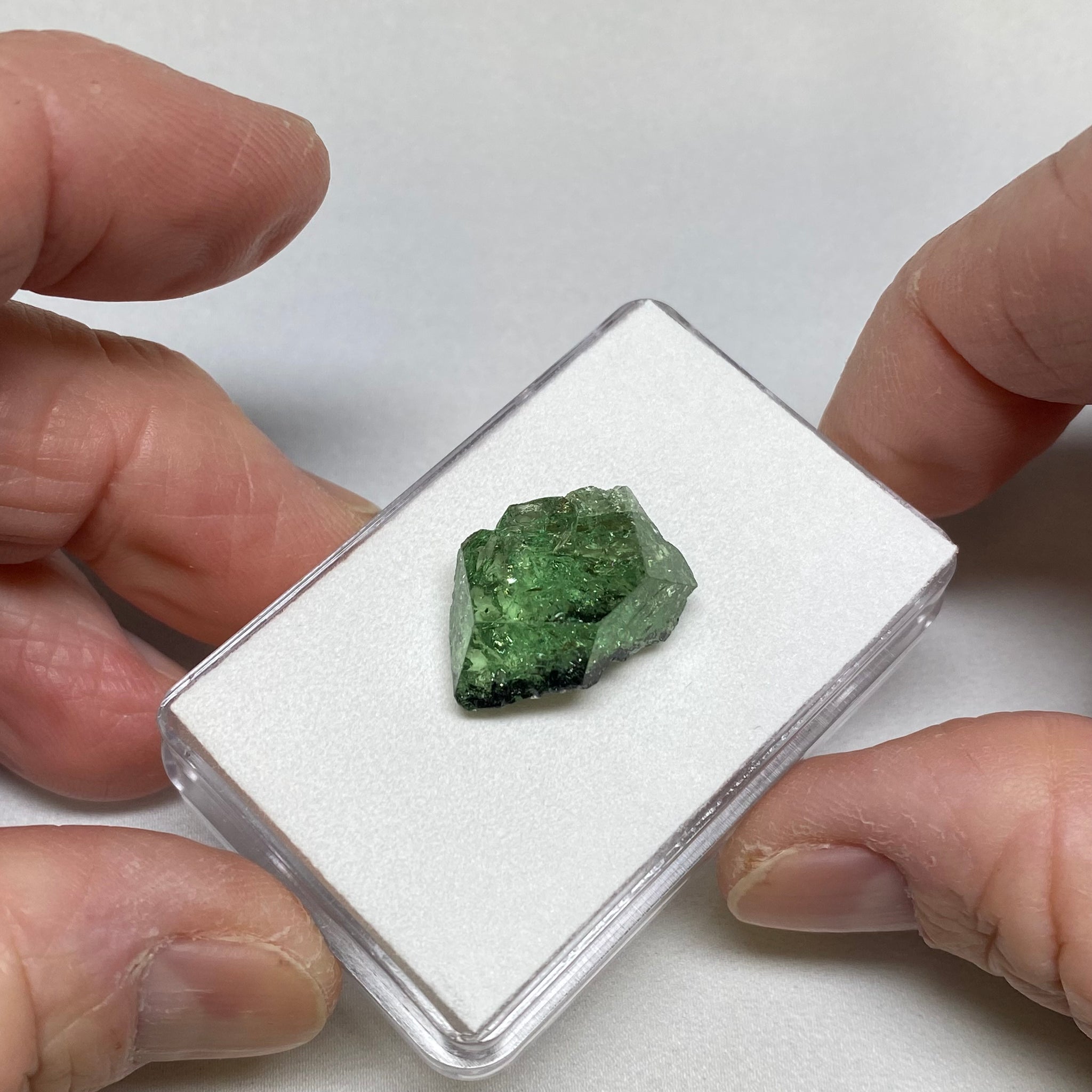 Tsavorite garnet crystal from Tanzania. The crystal is shown in natural, uncut form with well-defined faces and a bright to medium green color