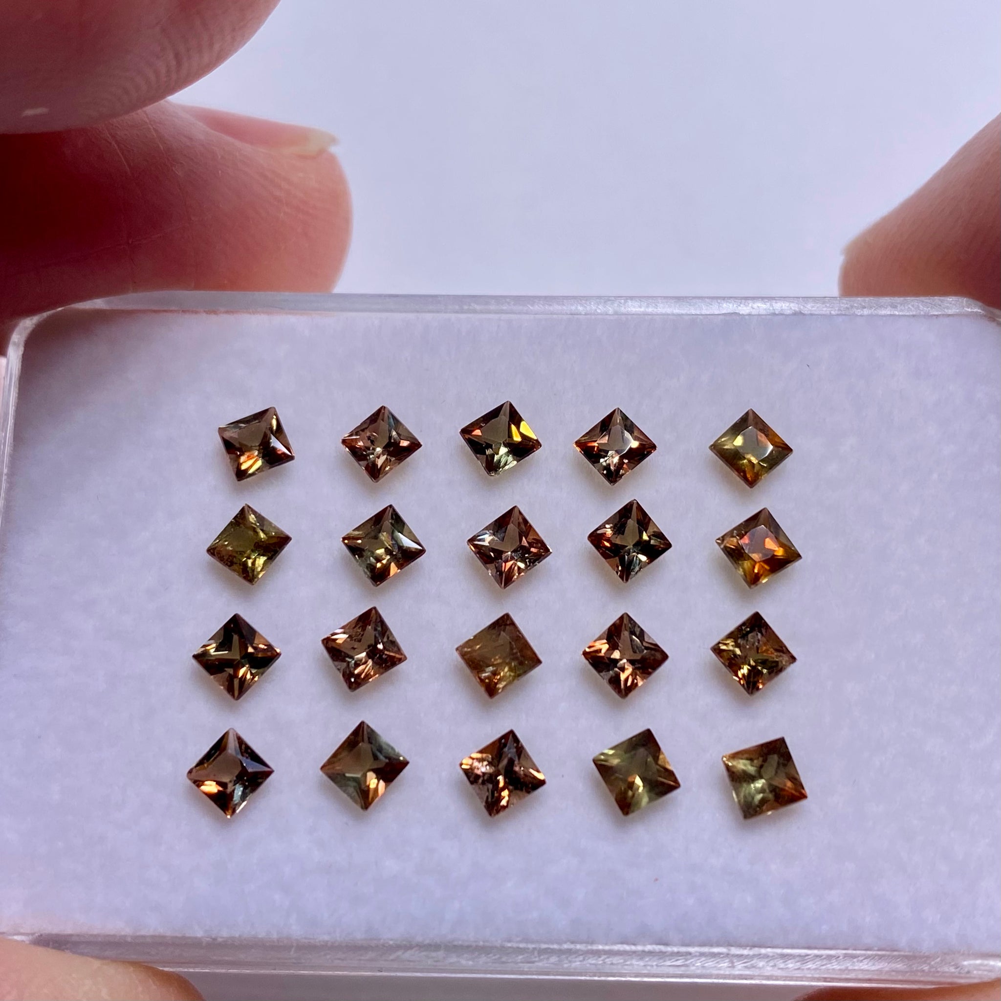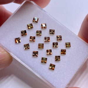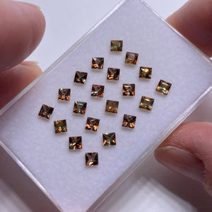 A full calibrated suite of princess cut Andalusite from Brazil. Known for its natural pleochroism, each stone shifts between earthy tones of bronze, olive, and burnt orange depending on the angle of view. Andalusite is an alumino-silicate mineral often found in metamorphic rocks and is prized for its optical complexity. This parcel is well-suited for matched sets or precision layout work