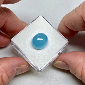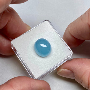 Milky aquamarine cabochon from Madagascar, cut with a smooth high dome to emphasize its soft blue body color and even translucency. The “milky” appearance comes from fine internal inclusions that scatter light, giving the stone a calm, diffused glow