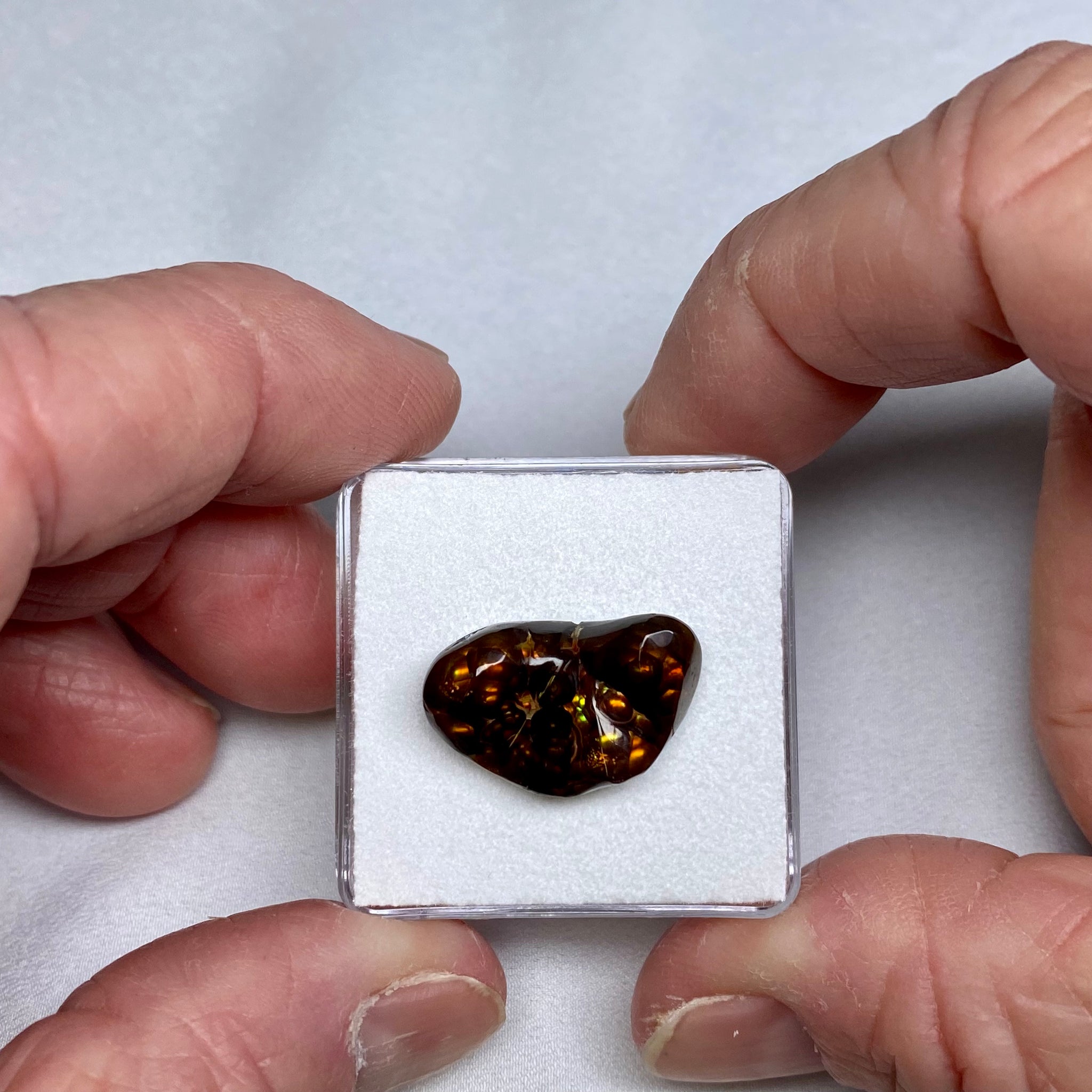 Fire agate from Arizona, a rare chalcedony variety where thin iron-oxide layers create this internal iridescence, making fine examples highly sought after for their natural, untreated color play
