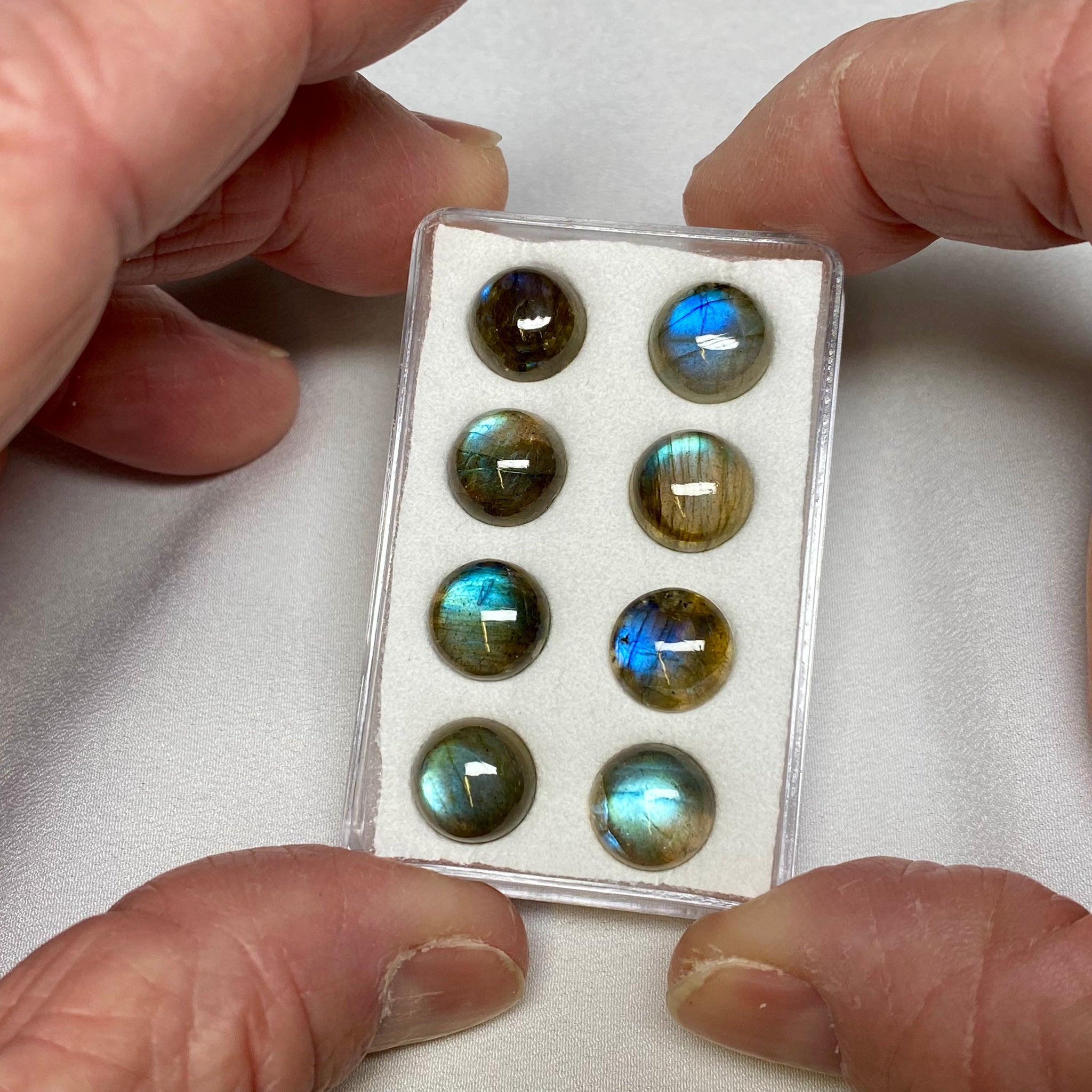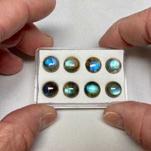 AAA quality Labradorite cabochons from Madagascar, displaying exceptional labradorescence with vibrant flashes of electric blue, green, and gold. Labradorite is treasured for its optical phenomenon, caused by light interference within the feldspar structure, and the finest gems show strong, colorful play across the entire surface. Madagascar is one of the most important sources of high-quality Labradorite, producing material admired worldwide for its brilliance and durability in jewelry