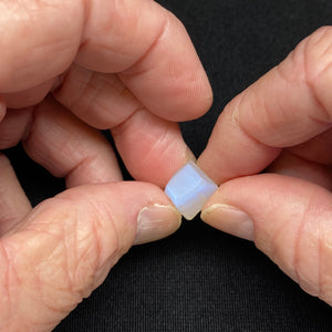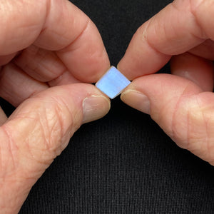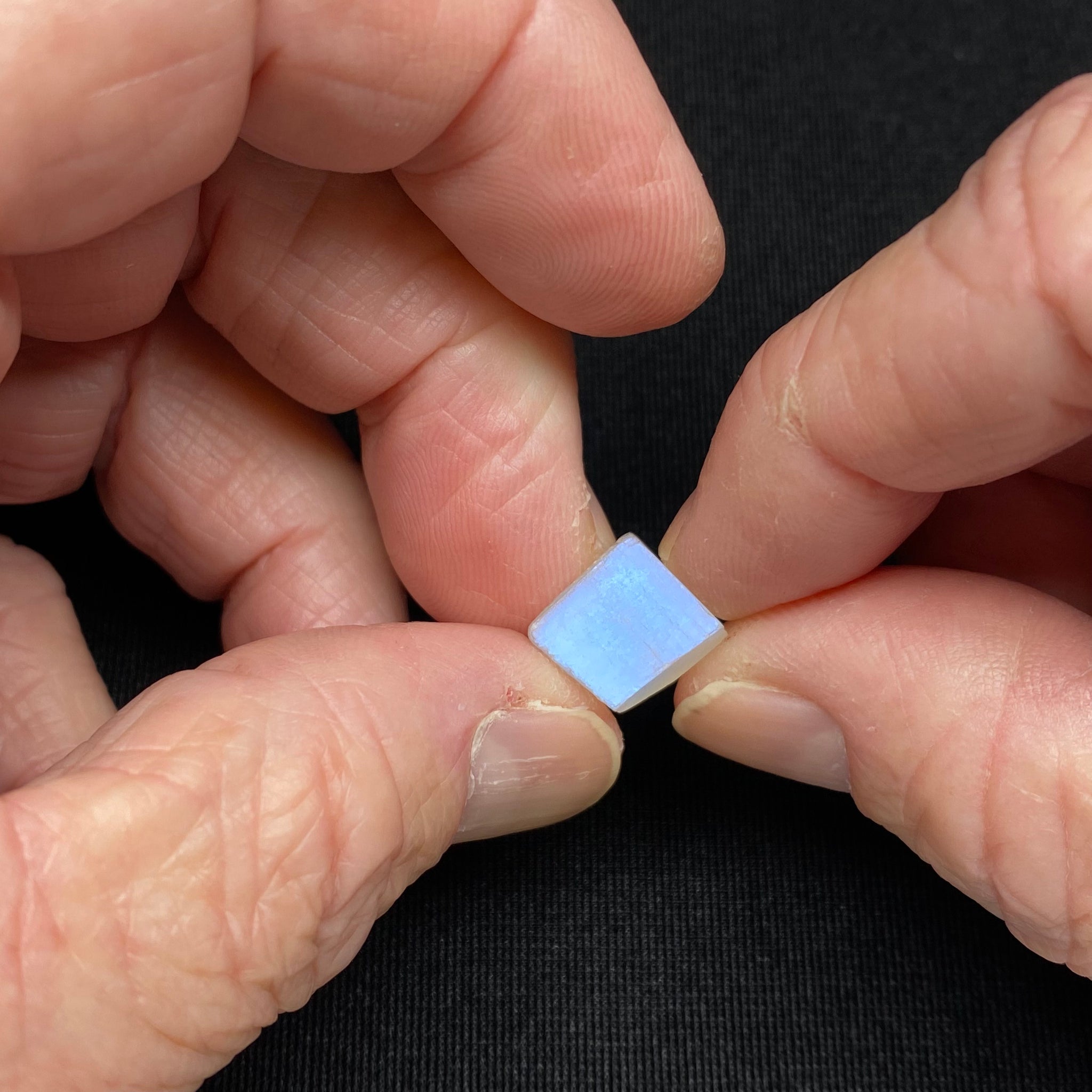 Blocky blue moonstone from Tanzania with a strong blue adularescence, showing a clean, square profile and a bold floating glow across the face.