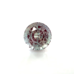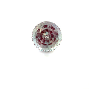 Synthetic Alexandrite grown by the Czochralski pulling method, precision cut into a round kaleidoscope-style brilliant. Shifts from a cool bluish-green in daylight to a vivid purple under warm indoor light — a classic alexandrite color change in lab-grown form