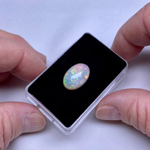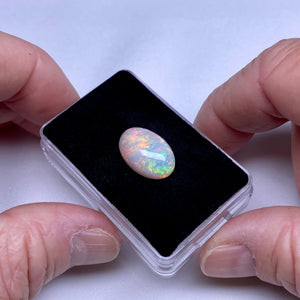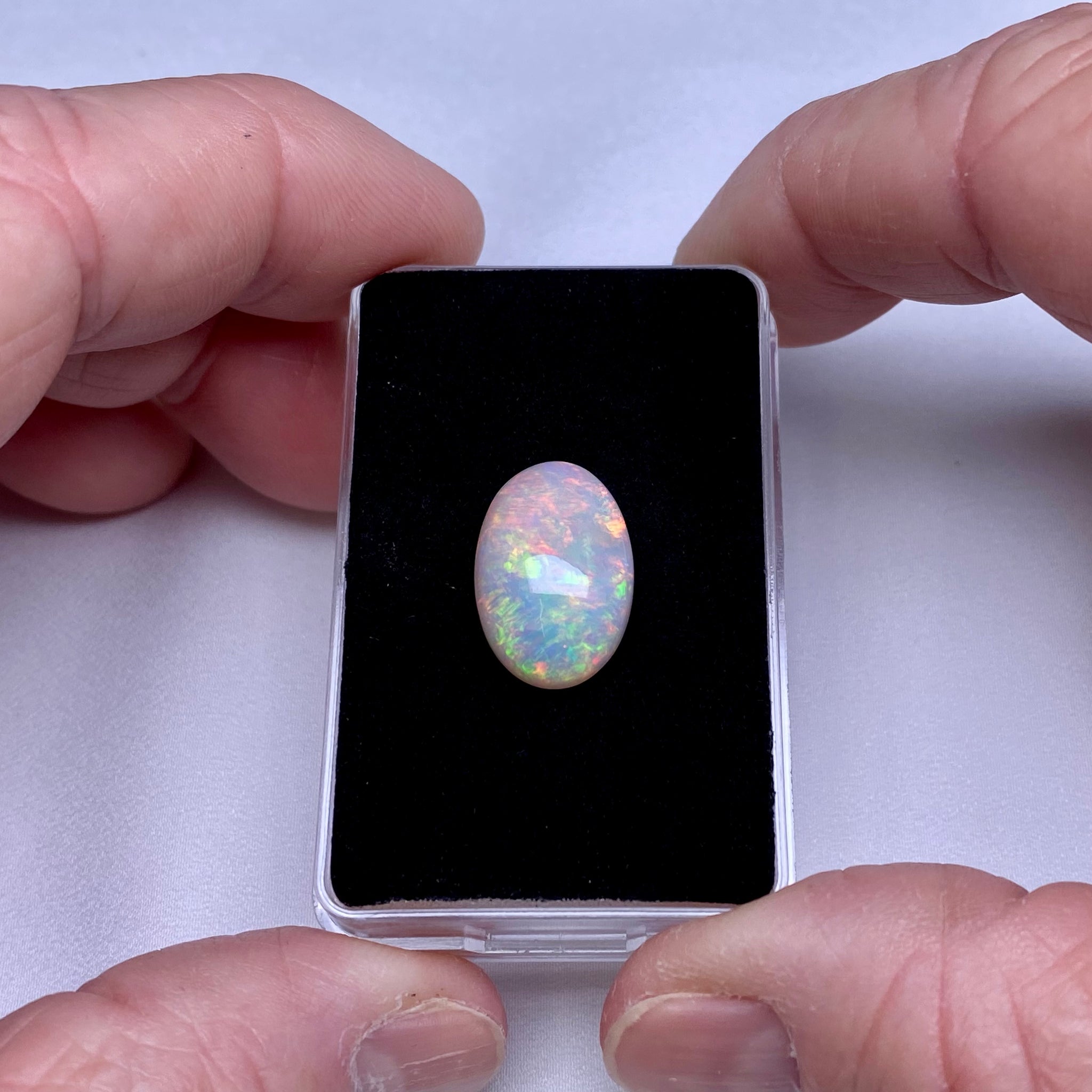 An oval Welo opal with bright, mixed-color play that shows well across the entire face. Ethiopian Welo opal forms in volcanic layers and often produces material with this kind of broad, shifting patterning