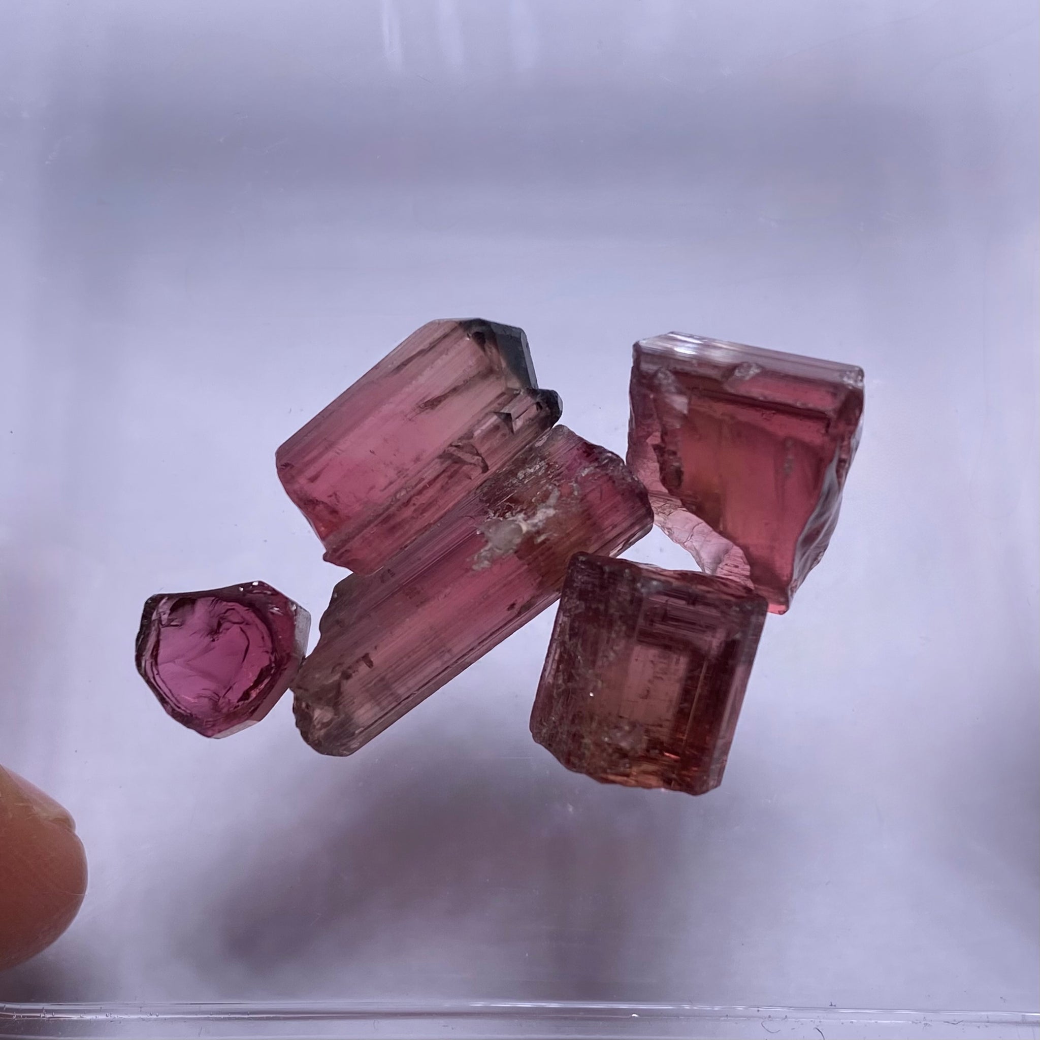 Rubellite old-stock material not seen much anymore. These have a cranberry quality that is hard to describe. Cool stuff!