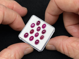 Ruby cabochons with bright gemmy color and excellent polish. Well-matched in tone and size, showing lively internal glow typical of quality corundum. A solid group for setting or for anyone collecting fine ruby cabochons