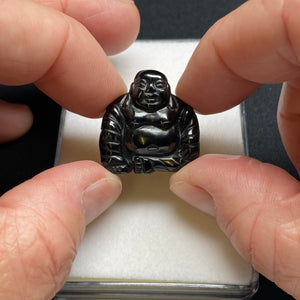 Happy Buddha carved from a single piece of pure black spinel from Bo Phloi, Kanchanaburi Province, Thailand.