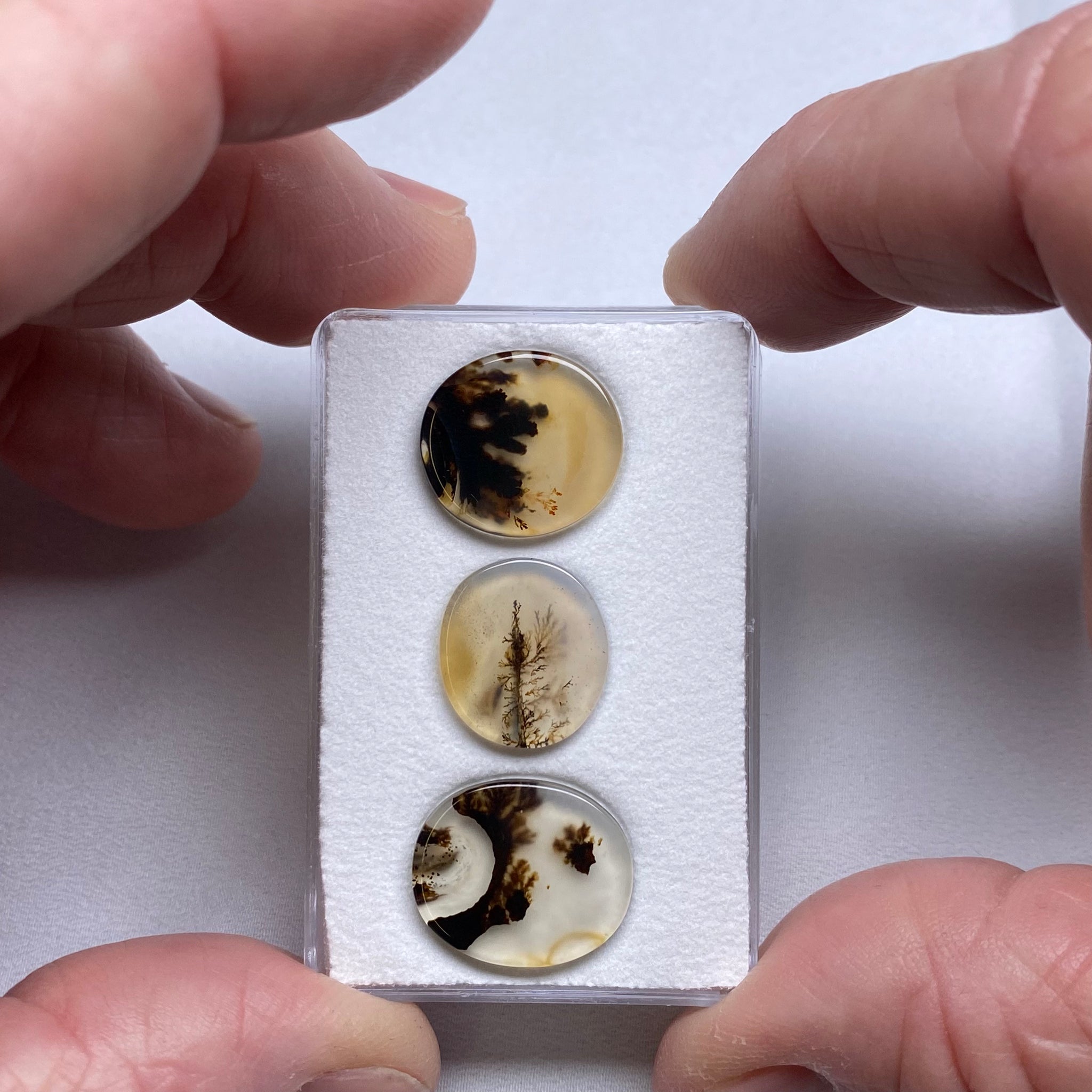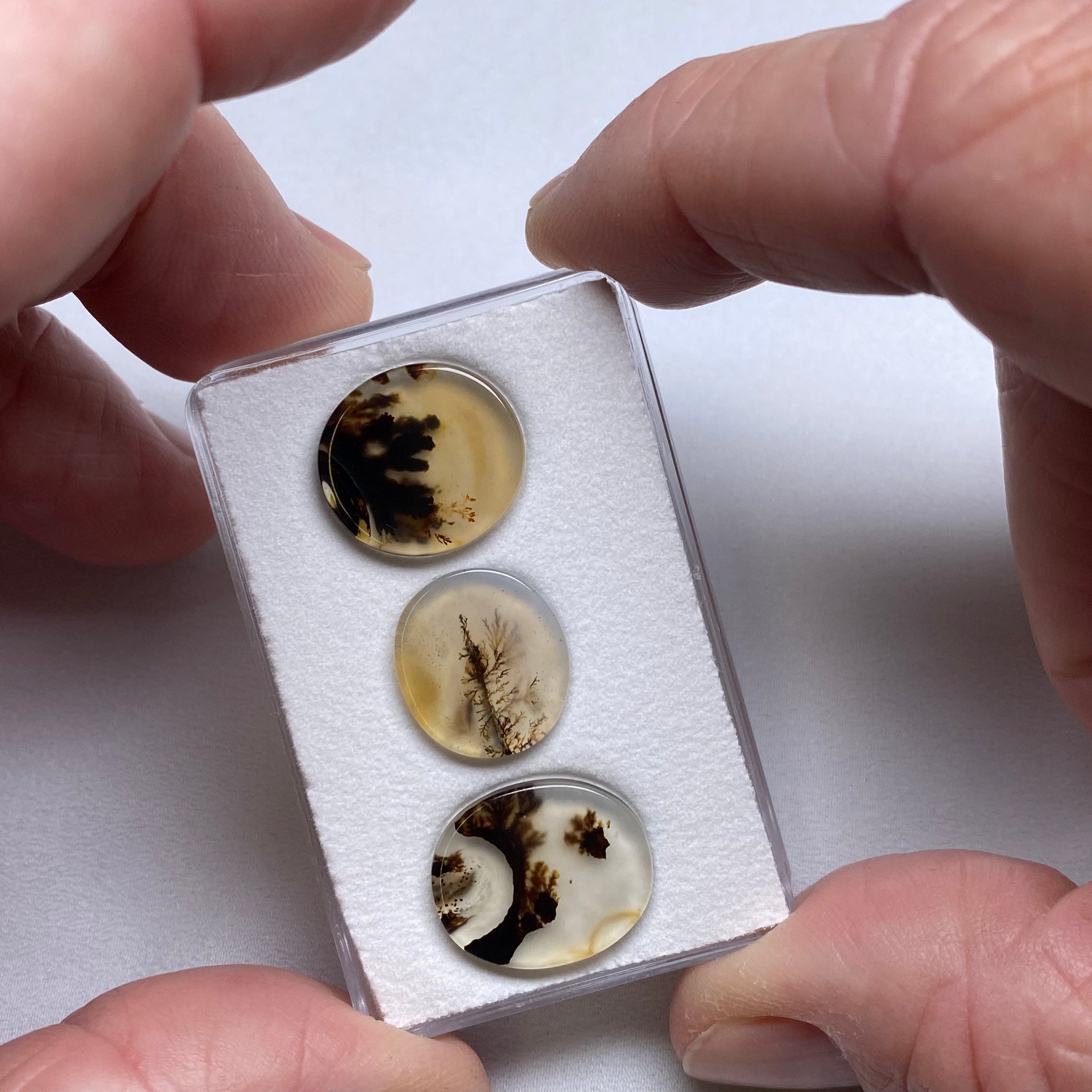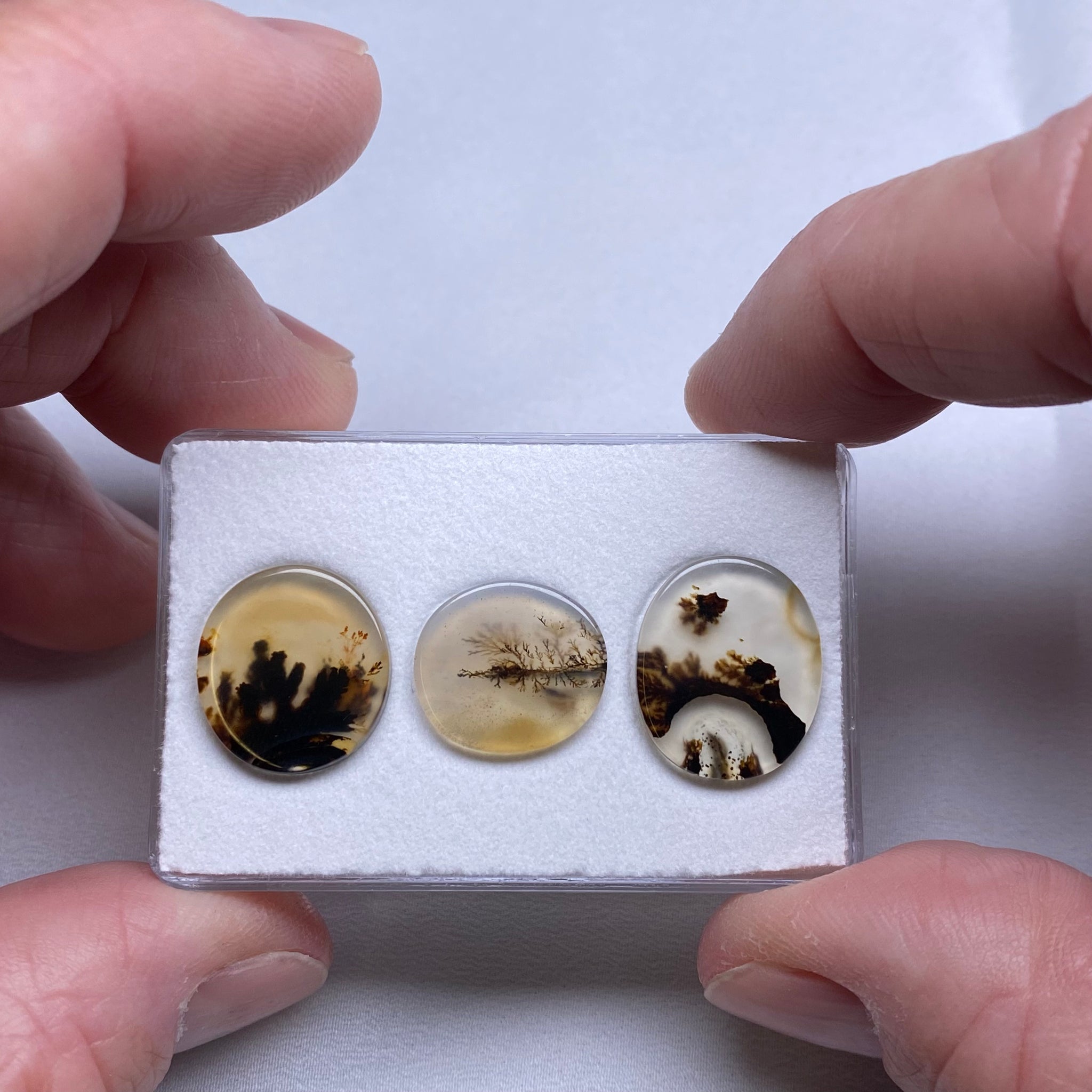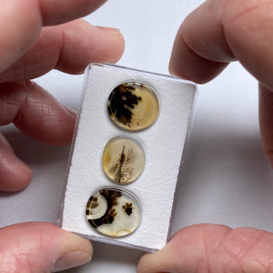 Three dendritic agate cabochons from Brazil. A clean trio with strong natural scene-like patterns.