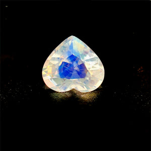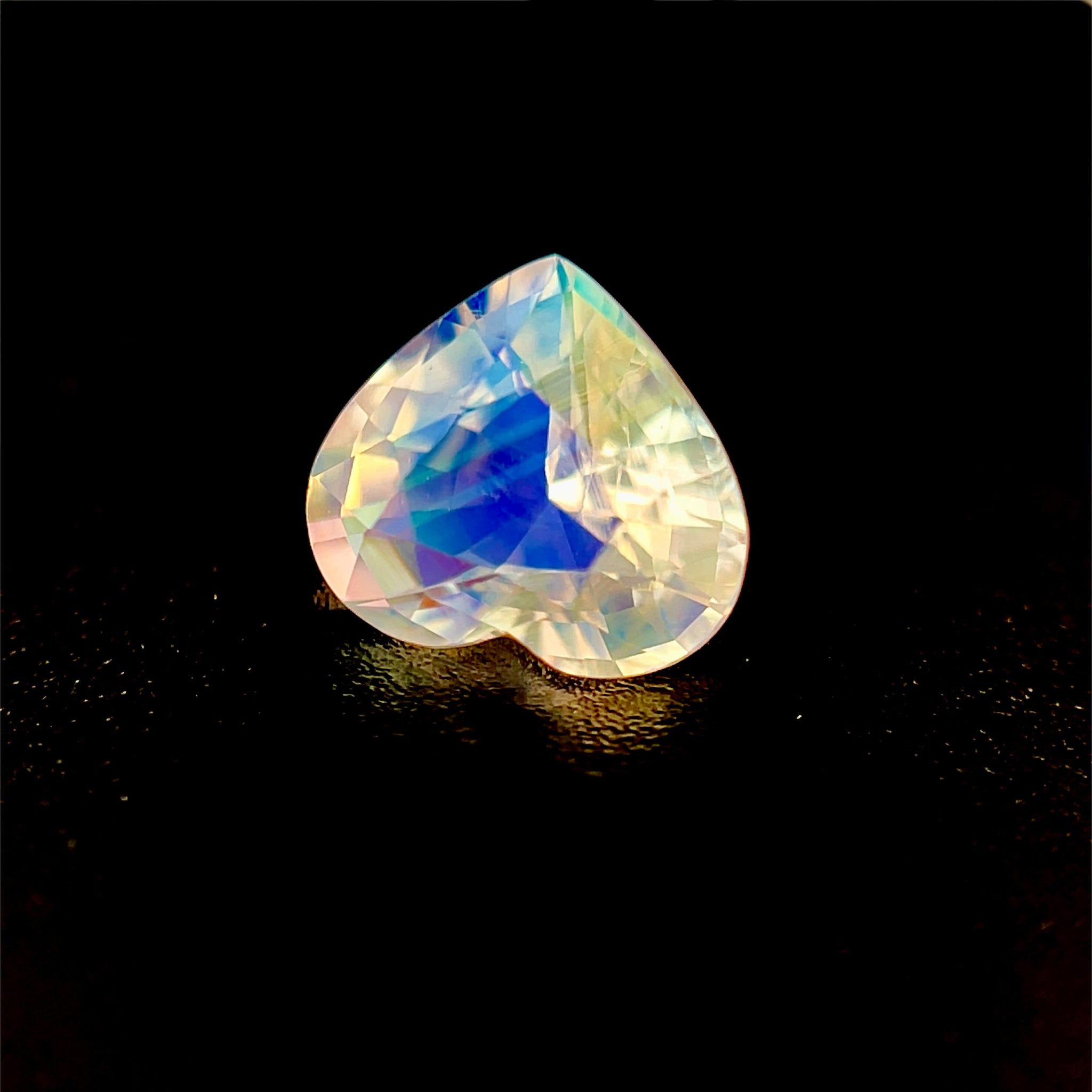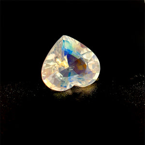 Heart-shaped rainbow moonstone from Madagascar showing strong multicolor adularescence (flash) across the surface