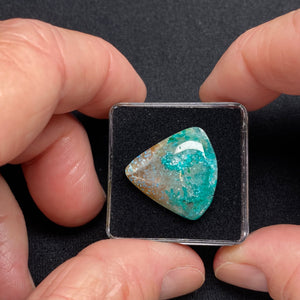 The vivid blue-green areas visible in the stone are caused by chrysocolla dispersed within the quartz structure, rather than being a separate layer or coating. Clear to lightly tinted zones represent purer chalcedony with less copper influence, while the tan to brown areas are residual host rock and iron-rich material from the original copper deposit. This intimate mixing of quartz, chrysocolla, and remnant matrix is typical of gem silica from historic Arizona copper mines.
