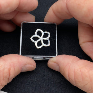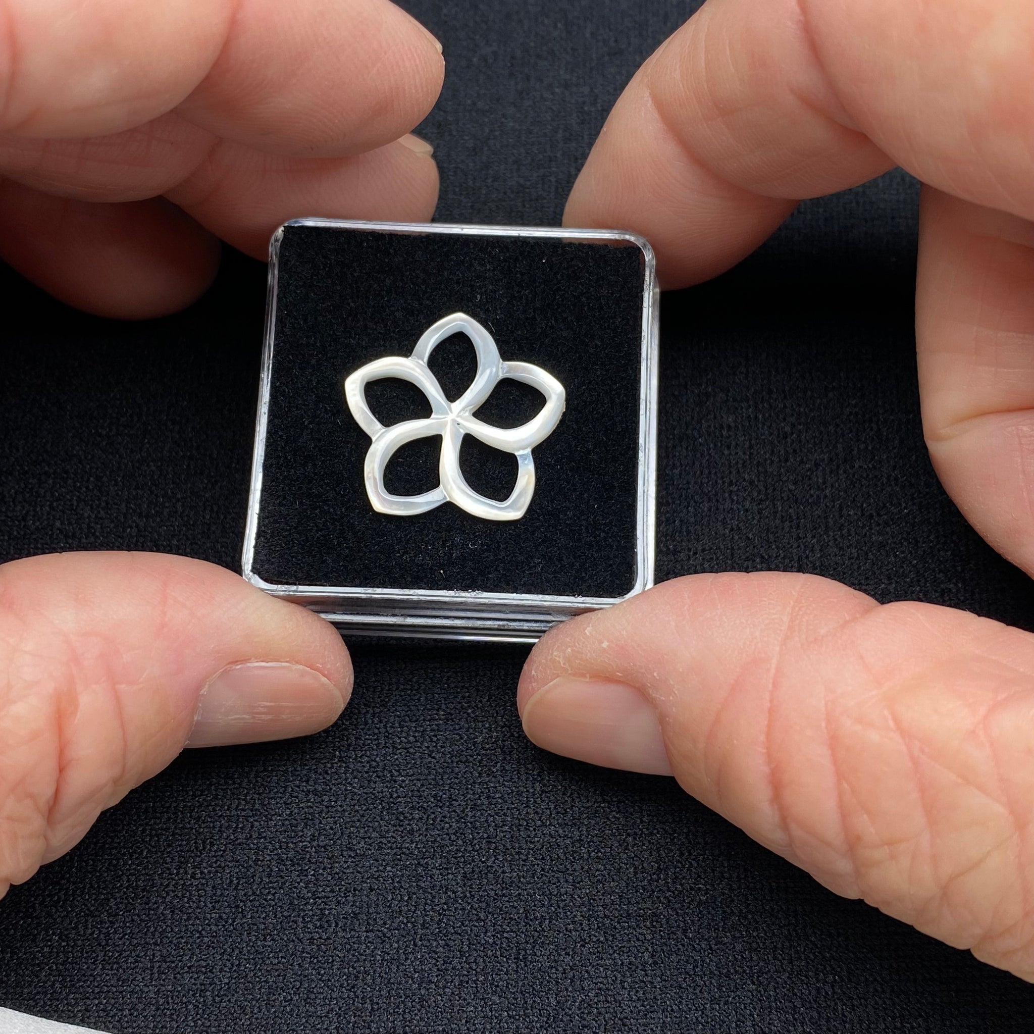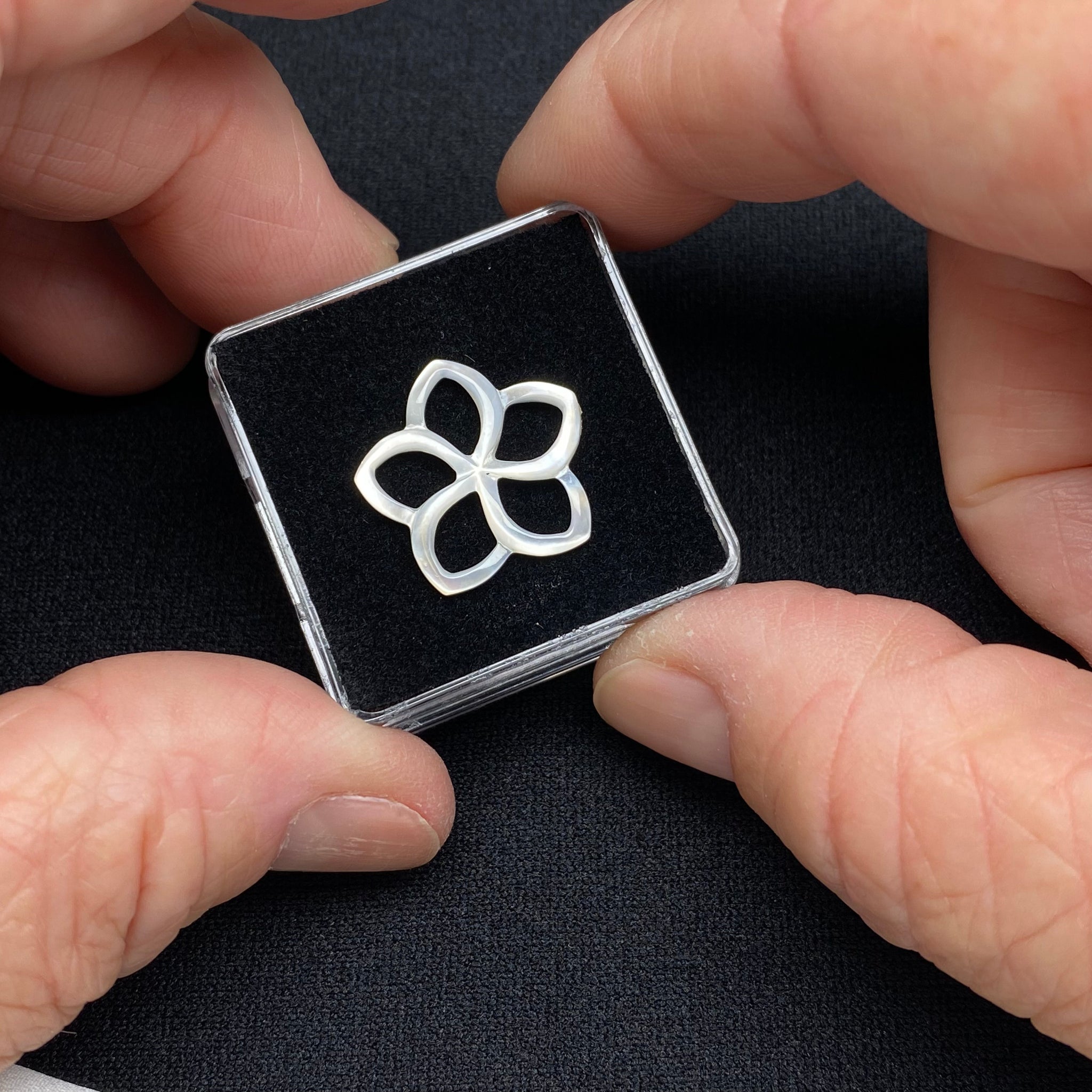 Mother-of-pearl carved in a classic quatrefoil form, a four-lobed motif long used in decorative arts and jewelry design