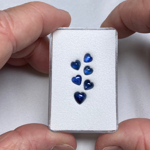A small group of heart-shaped blue sapphire cabochons from Sri Lanka. The color ranges from deep royal blue to slightly lighter blue tones, with natural variation between stones