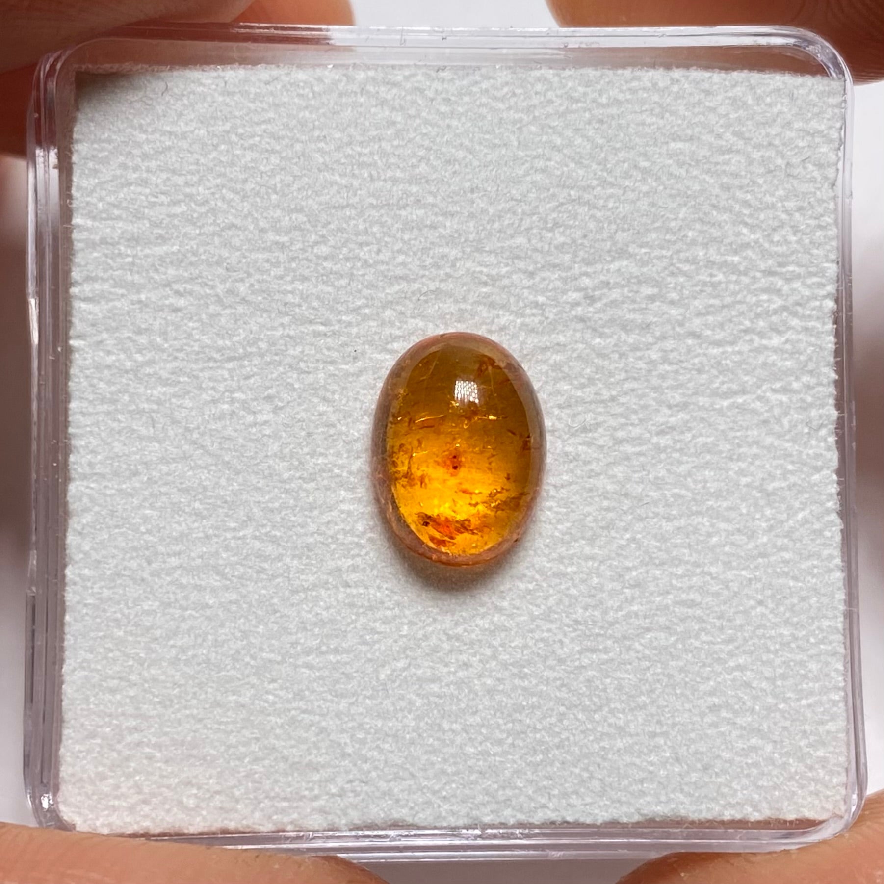 A vivid orange oval cabochon from the Loliondo Spessartite deposit in northern Tanzania.