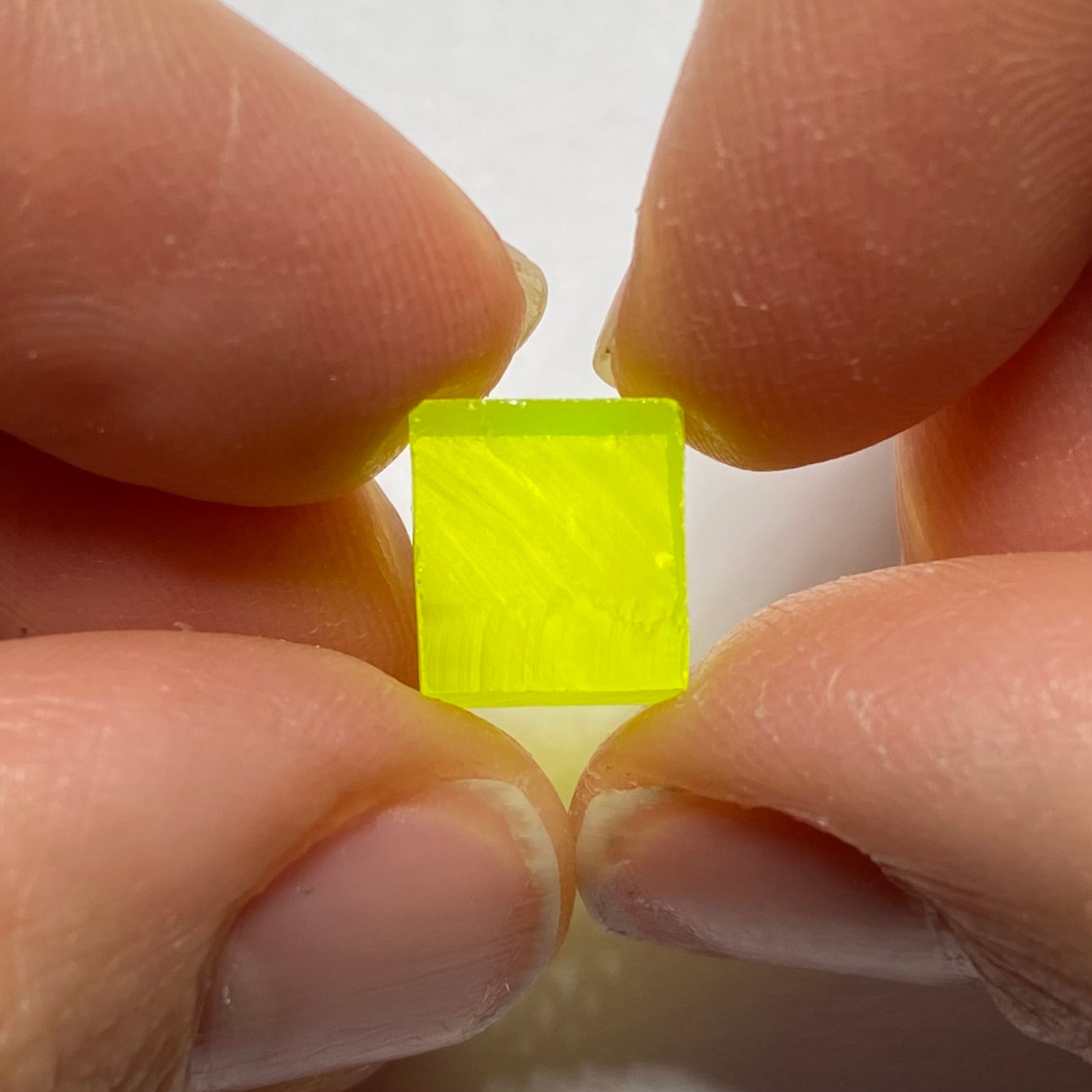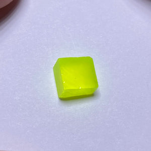 LuAG (Lutetium Aluminum Garnet), also known as Lumogarnet. Lab-grown material with intense neon yellow color and high density. Composed of lutetium aluminum oxide, it is among the most UV-reactive of the synthetic garnets, showing INTENSE fluorescence under ultraviolet light. Valued for its brilliance and durability in both optical and faceting