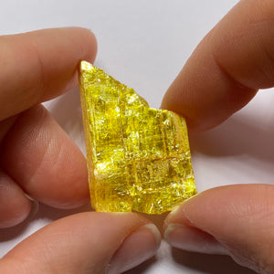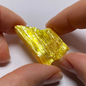 A striking piece of Orpiment, notable for its vibrant yellow color and layered, foliated structure. Orpiment is an arsenic sulfide mineral (As₂S₃) and is often associated with hydrothermal deposits, frequently found alongside other sulfides like realgar. Its name is derived from the Latin words "aurum" (gold) and "pigmentum" (paint), reflecting its brilliant golden-yellow hue. This piece would be a fascinating addition to any mineral collection, especially given its striking aesthetic and the relatively rare occurrence of high-quality crystals like this
