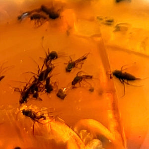 Golden Burmese amber with multiple well-preserved insect inclusions. The insects appear to be small flies (Diptera), a common group found in amber deposits. Their detail is sharply visible under magnification, offering a direct window into ancient ecosystems.