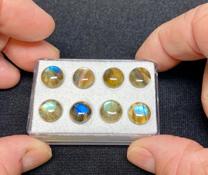 AAA quality Labradorite cabochons from Madagascar, displaying exceptional labradorescence with vibrant flashes of electric blue, green, and gold. Labradorite is treasured for its optical phenomenon, caused by light interference within the feldspar structure, and the finest gems show strong, colorful play across the entire surface. Madagascar is one of the most important sources of high-quality Labradorite, producing material admired worldwide for its brilliance and durability in jewelry