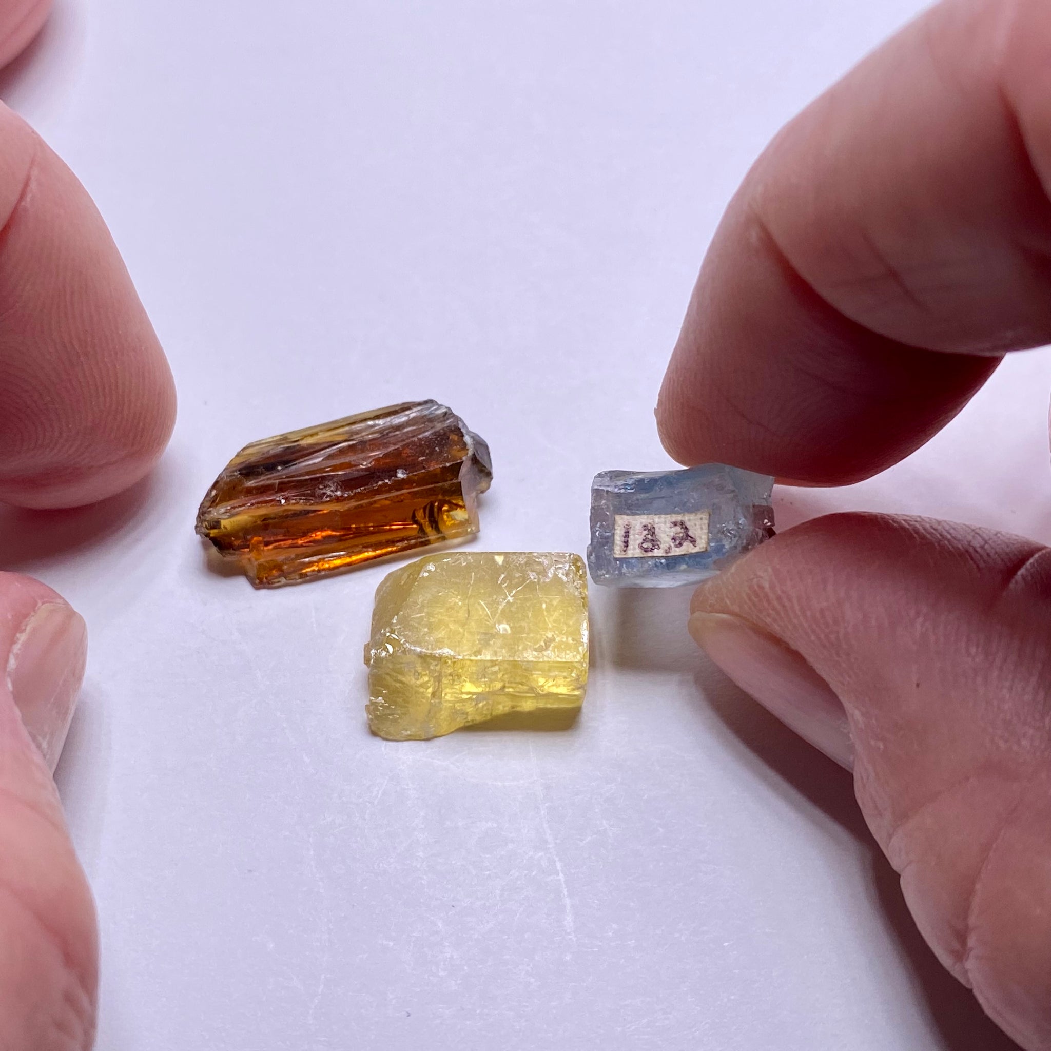 A rare group of natural Barite faceting rough from an old private collection, representing three distinct localities and color varieties. The golden yellow is from Tuscany, Italy; the pale blue from Colorado, USA; and the deep cognac-colored rough from Russia.