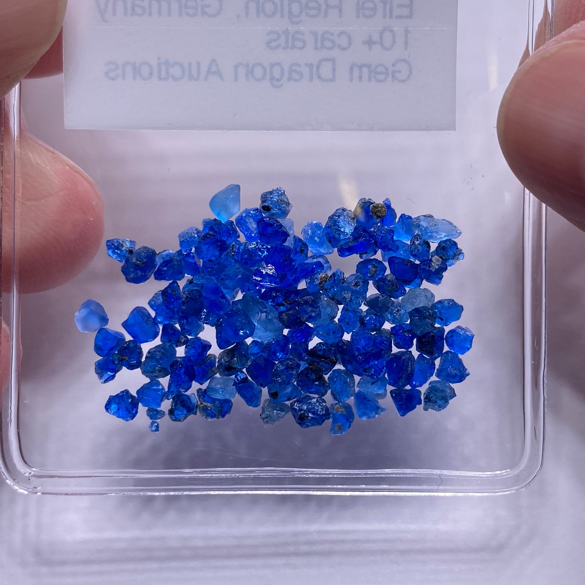 Sourced from the Eifel Region of Germany, this electric blue feldspathoid belongs to the sodalite group. It has a Moh's hardness of 5.5 – 6 and a Refractive Index of 1.498 – 1.507 and intense UV reactivity.