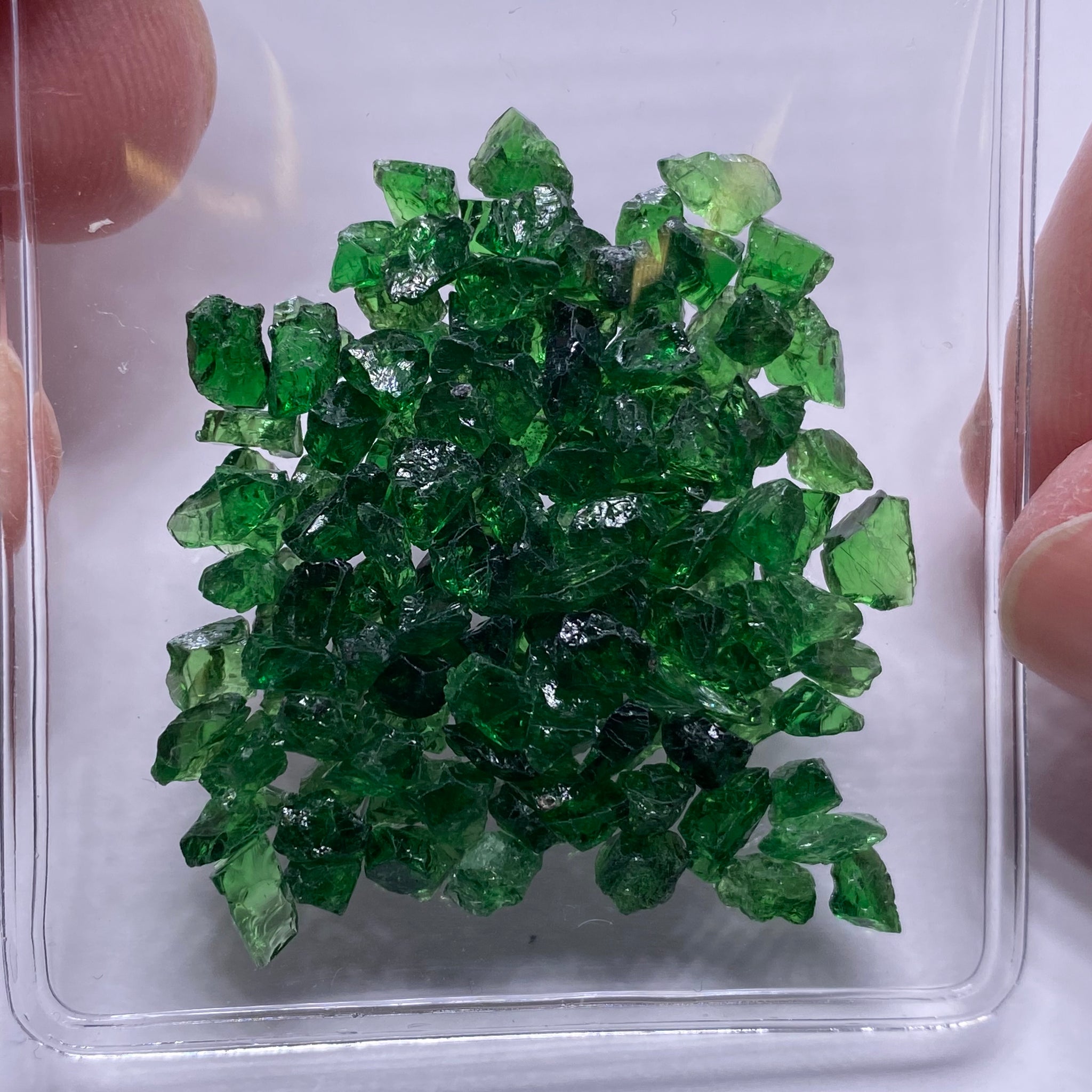 Parcel of melee-size Tsavorite garnet rough from Tanzania. Vibrant green tones ranging from bright grassy greens to deeper forest shades.