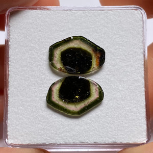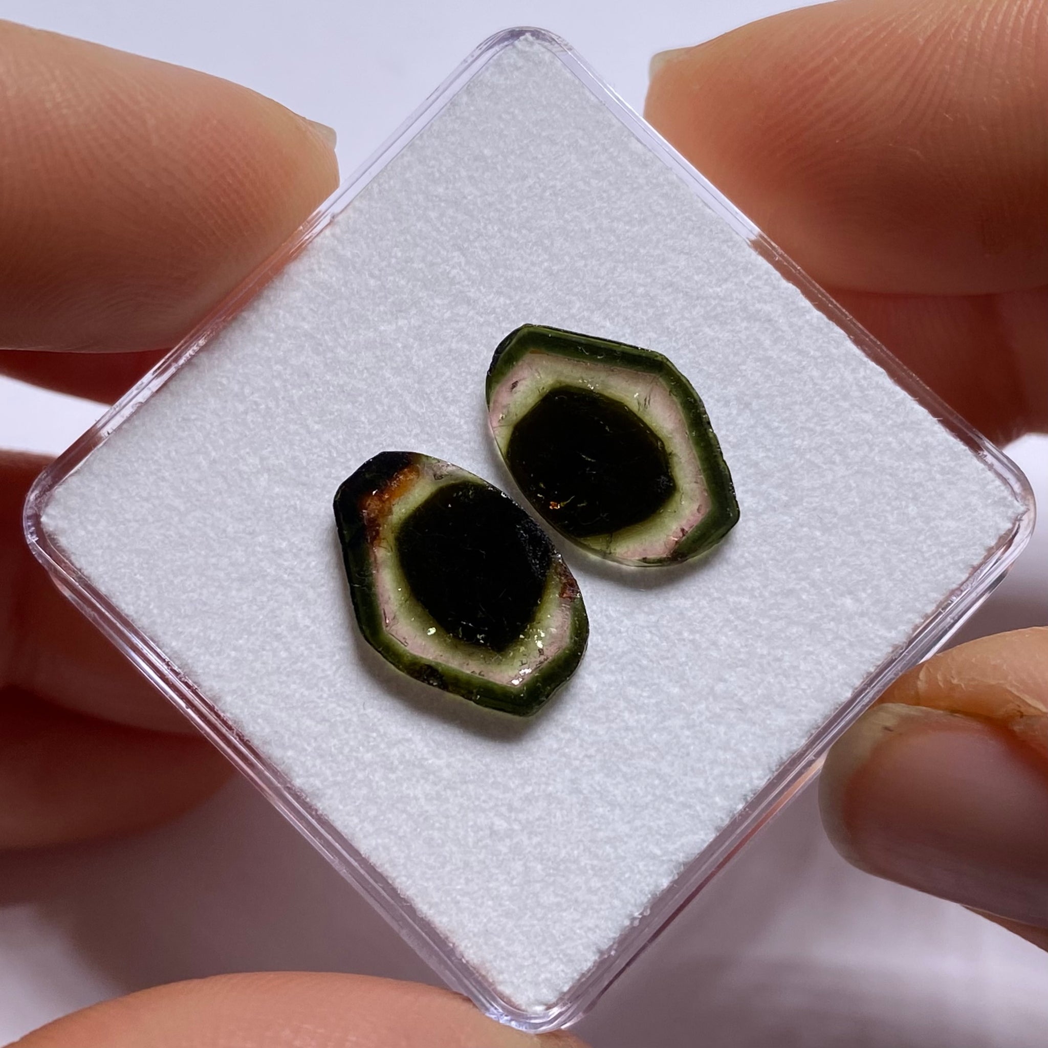 Old-stock watermelon tourmaline slices from Brazil, displaying vibrant pink cores surrounded by distinct green and dark outer zones. These natural cross-sections show the classic bullseye pattern that defines true watermelon tourmaline. Well-preserved and sharply banded, they're ideal for collectors or use in custom jewelry.