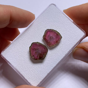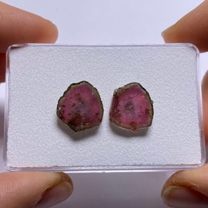 Old-stock watermelon tourmaline slices from Brazil, displaying vibrant pink cores surrounded by distinct green and dark outer zones. These natural cross-sections show the classic bullseye pattern that defines true watermelon tourmaline. Well-preserved and sharply banded, they're ideal for collectors or use in custom jewelry.