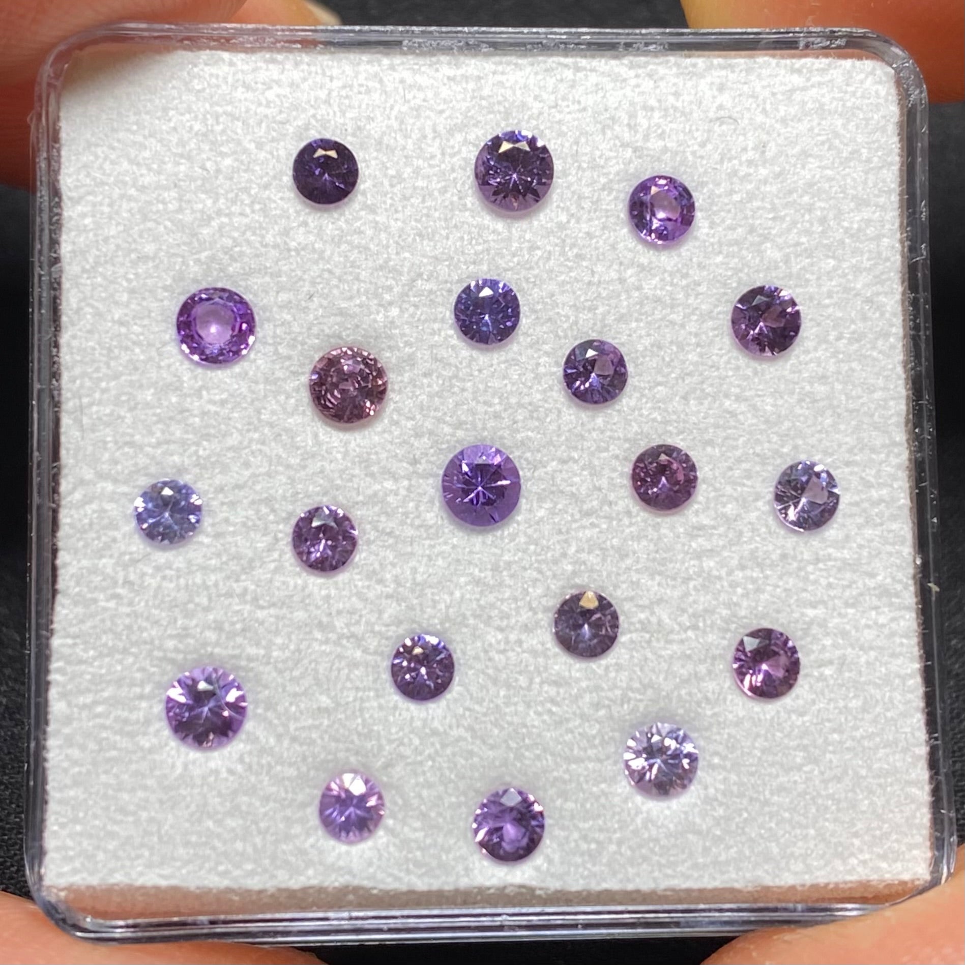 Purple Sapphires from Madagascar. Natural corundum showing a range of violet to lilac tones with bright, precision cutting. Known for strong brilliance and consistent color from the Ilakaka deposits.